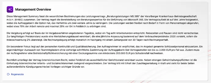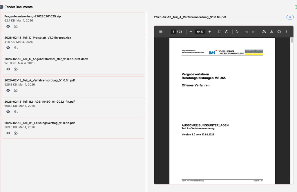 Komplexe Ausschreibungen auf einen Blick verstehen. Schluss mit dem Lesen von 100-seitigen PDFs zur ersten Sichtung. Wir generieren eine strukturierte Zusammenfassung. Alle harten Fakten, Risiken und Chancen kompakt auf einer Seite – für eine fundierte und schnelle Go/No-Go-Entscheidung.