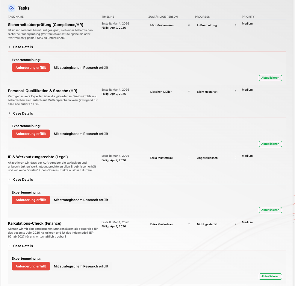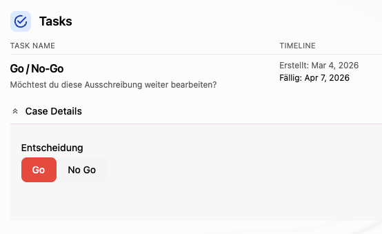 Vom Go direkt in die Umsetzung. Sobald Sie sich für eine Ausschreibung entscheiden, erstellt das System eine detaillierte Taskliste. Verantwortlichkeiten werden automatisch zugewiesen.