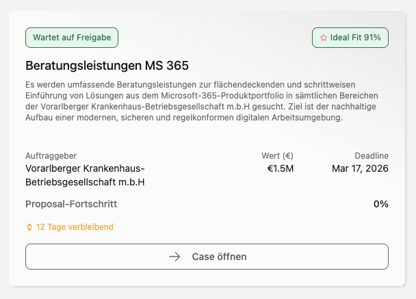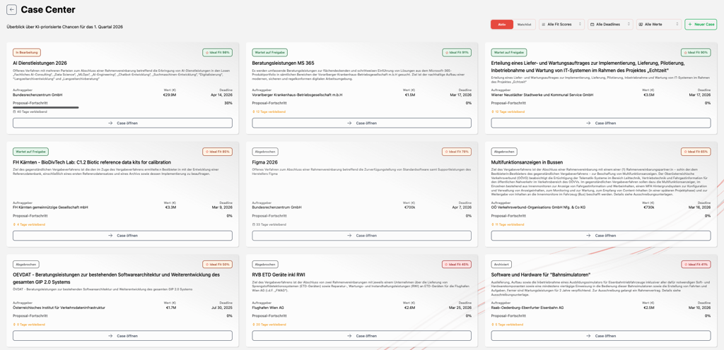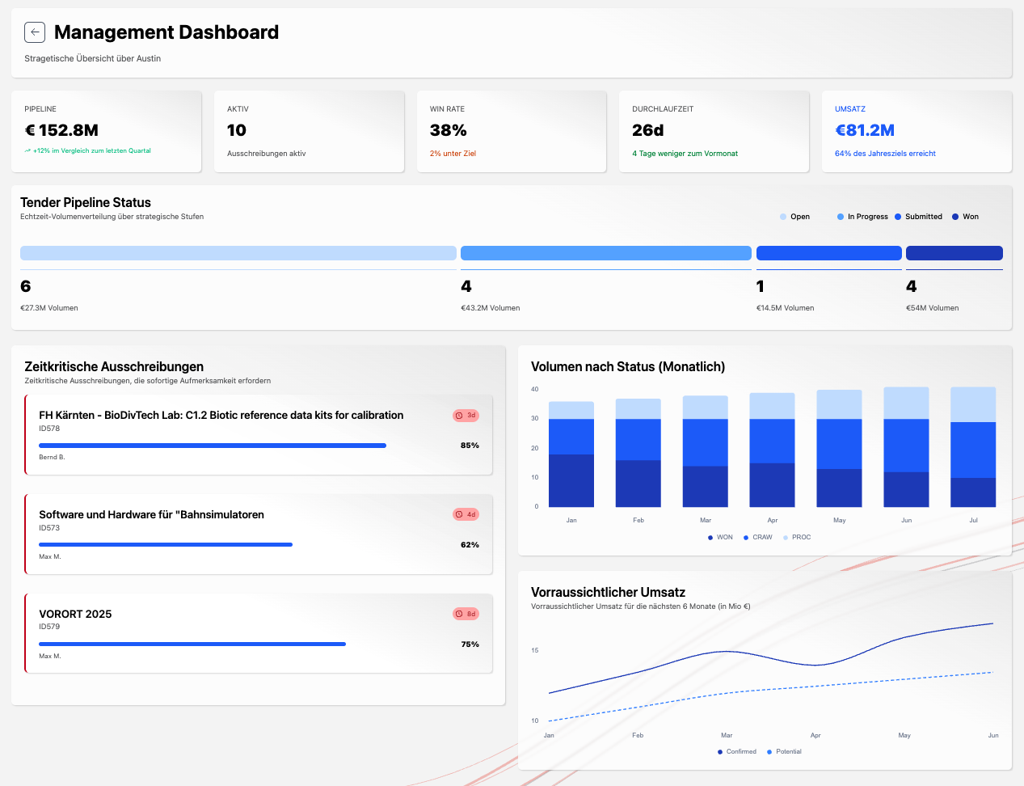 Behalten Sie das Big Picture im Auge. In unserem Dashboard laufen alle Fäden zusammen. Überwachen Sie laufende Fristen, den Status Ihrer Bids und die Auslastung Ihres Teams. Verpassen Sie nie wieder eine Deadline.